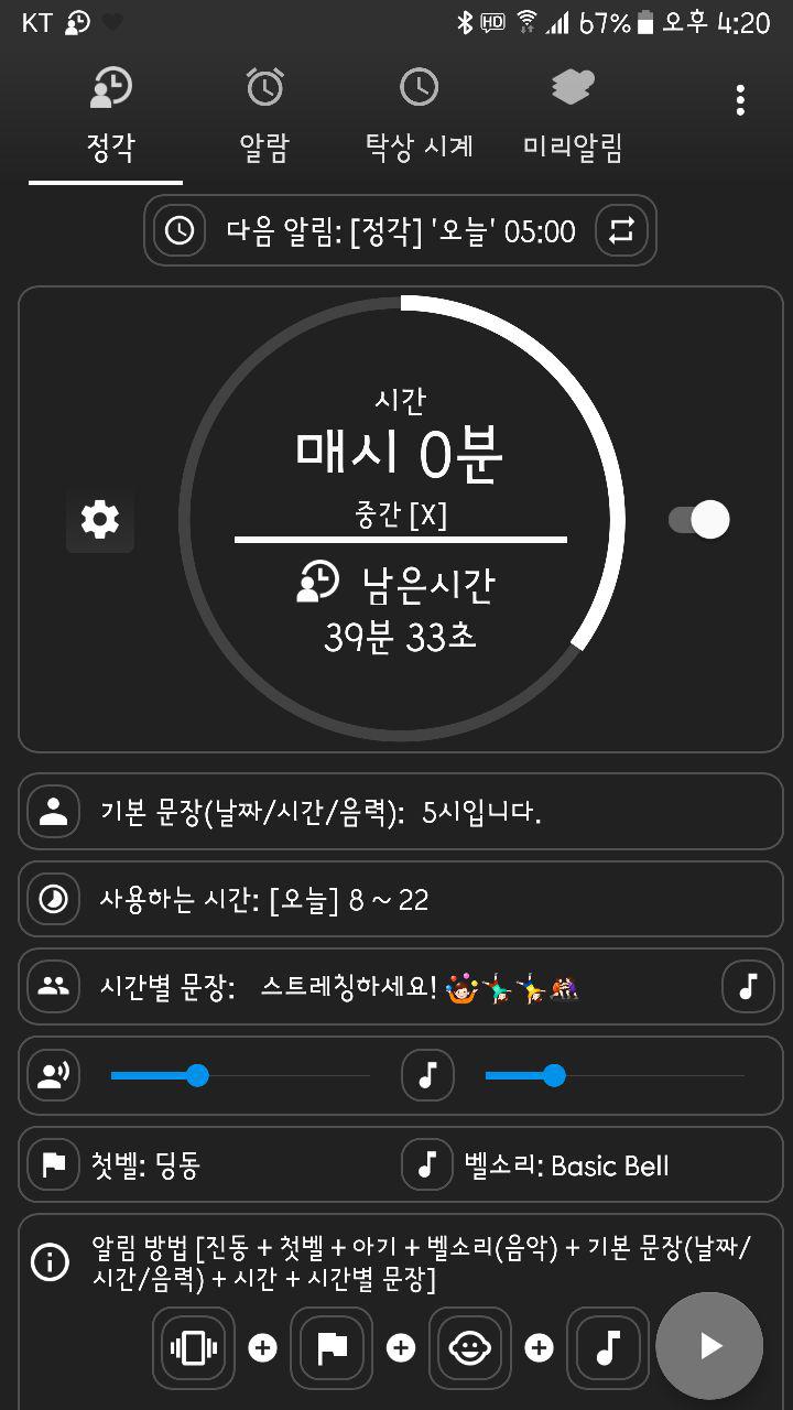 ■ 내 마음대로 만드는 맞춤형 정각 알림 & 뮤직 알람! ⏰ - 음성만으로, 이어폰만으로(도서관, 독서실등), 아기 목소리만(영어 아기, 한국어 아기 버전)으로, 벨만으로, 뮤직(mp3등)만으로, LED만으로, 상태바만으로, 진동만으로 또는 각각 조합으로 만들 수 있습니다. - 매시 정각에 요일 별로 시간별로 다른 음악 한곡을 전체 감상! - 음력 / 간지 말하기 - 원하는 날짜 / 시간 / 분에 원하는 음악 한 곡 듣기! - 각 알람 마다 다른 음악!