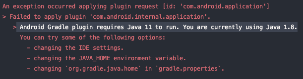 > Android Gradle plugin requires Java 11 to run. You are currently using Java 1.8.